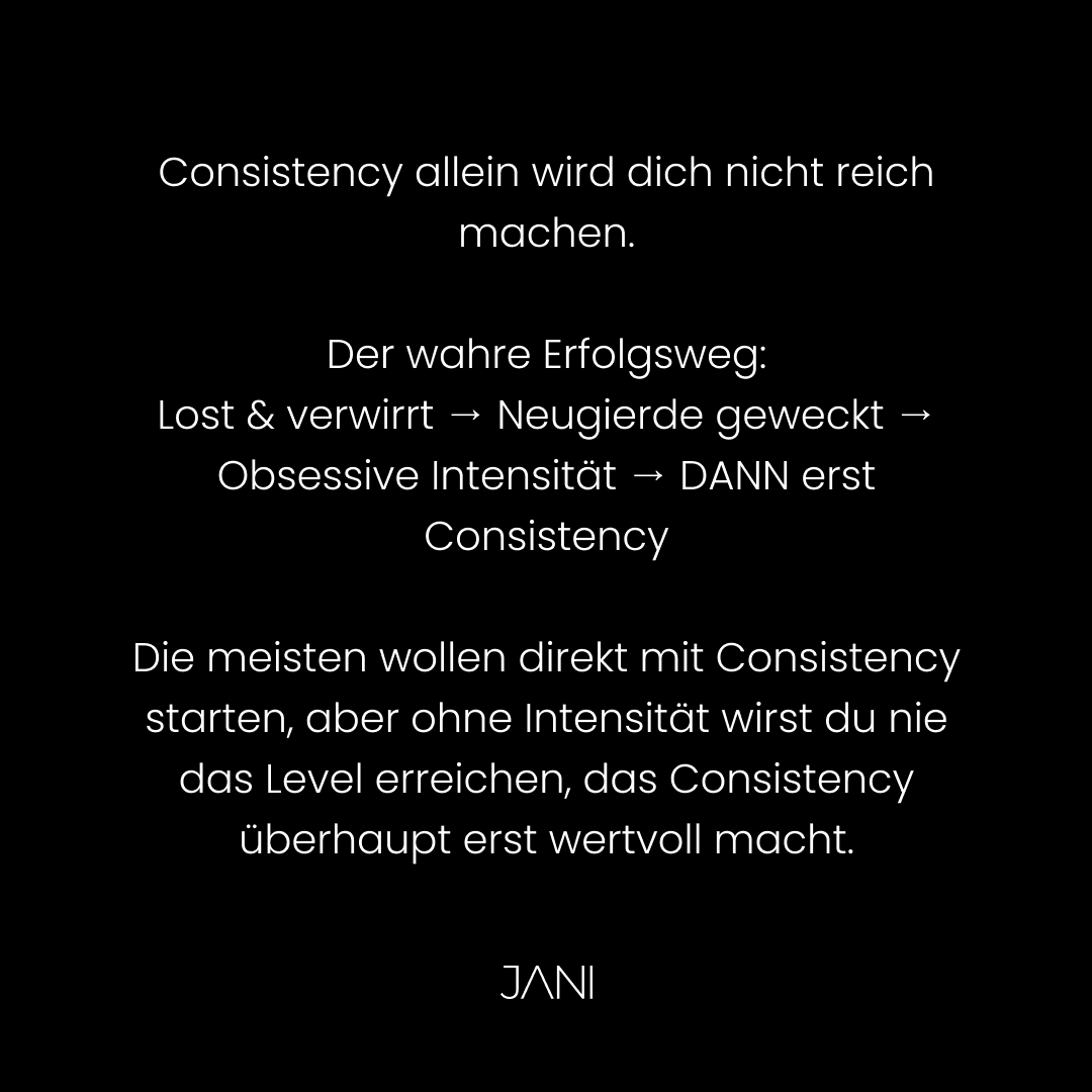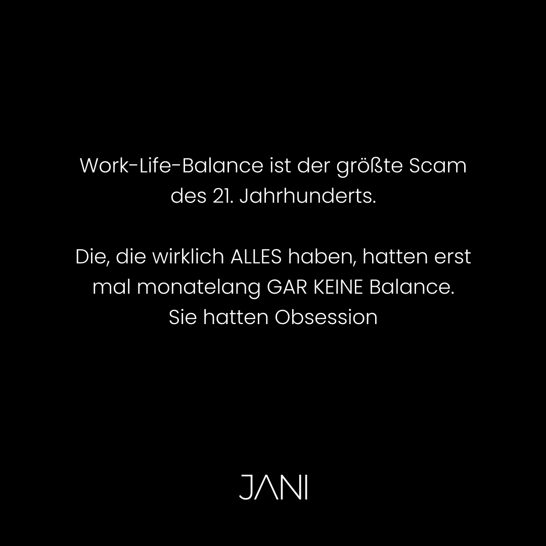 Hier ist die Wahrheit: Echter, krasser Erfolg braucht keine Balance. Er braucht anfängliche Obsession. Die Art von Fokus, bei der du alles andere beiseite schiebst und EINE Sache meisterst.