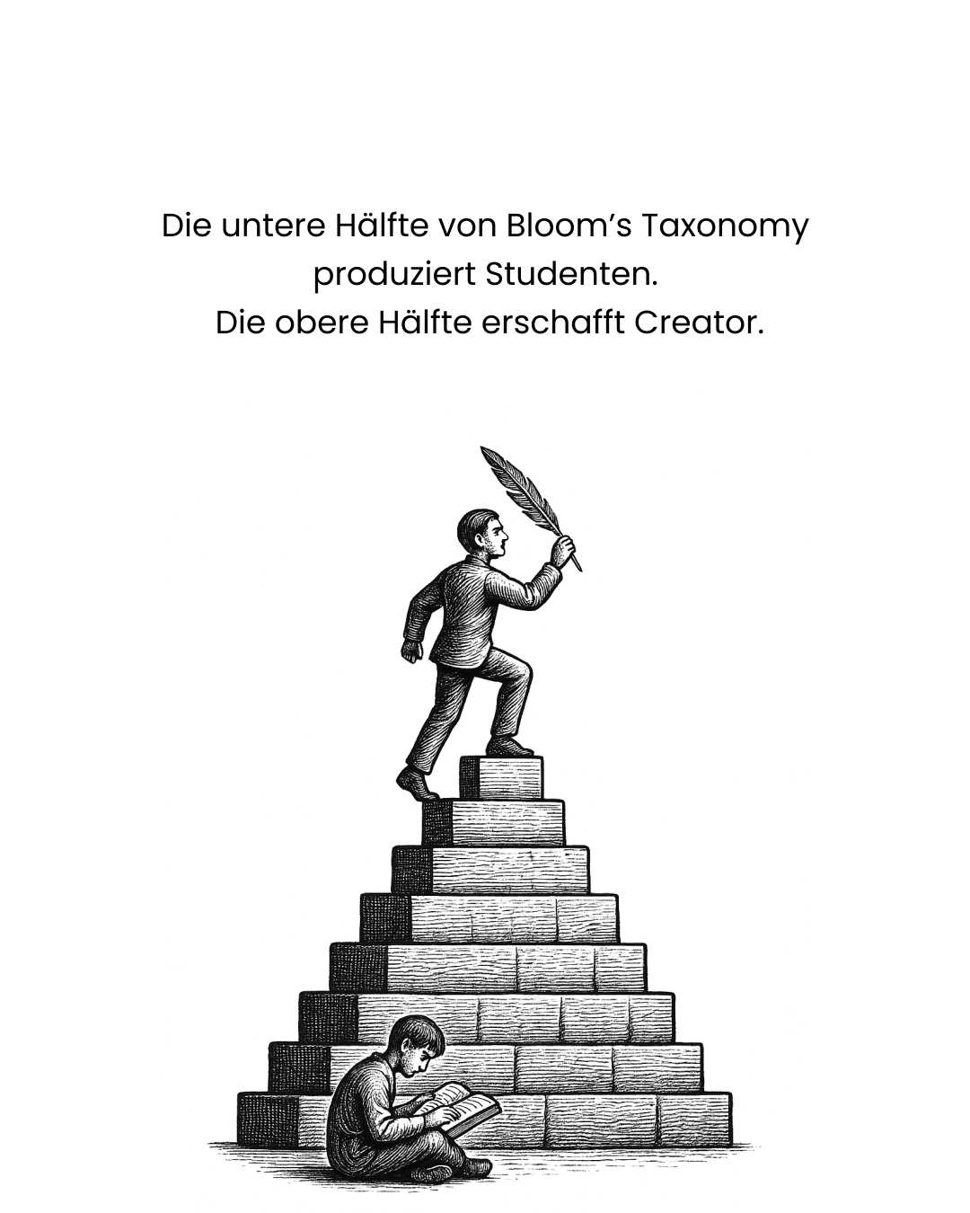 Diese industrielle Logik steckt bis heute in unseren Klassenzimmern. Wir werden darauf trainiert, Wissen zu reproduzieren, nicht zu reflektieren.Deshalb bleiben die meisten ihr Leben lang auf den unteren Ebenen von Bloom’s Taxonomy stecken: Erinnern. Verstehen.
